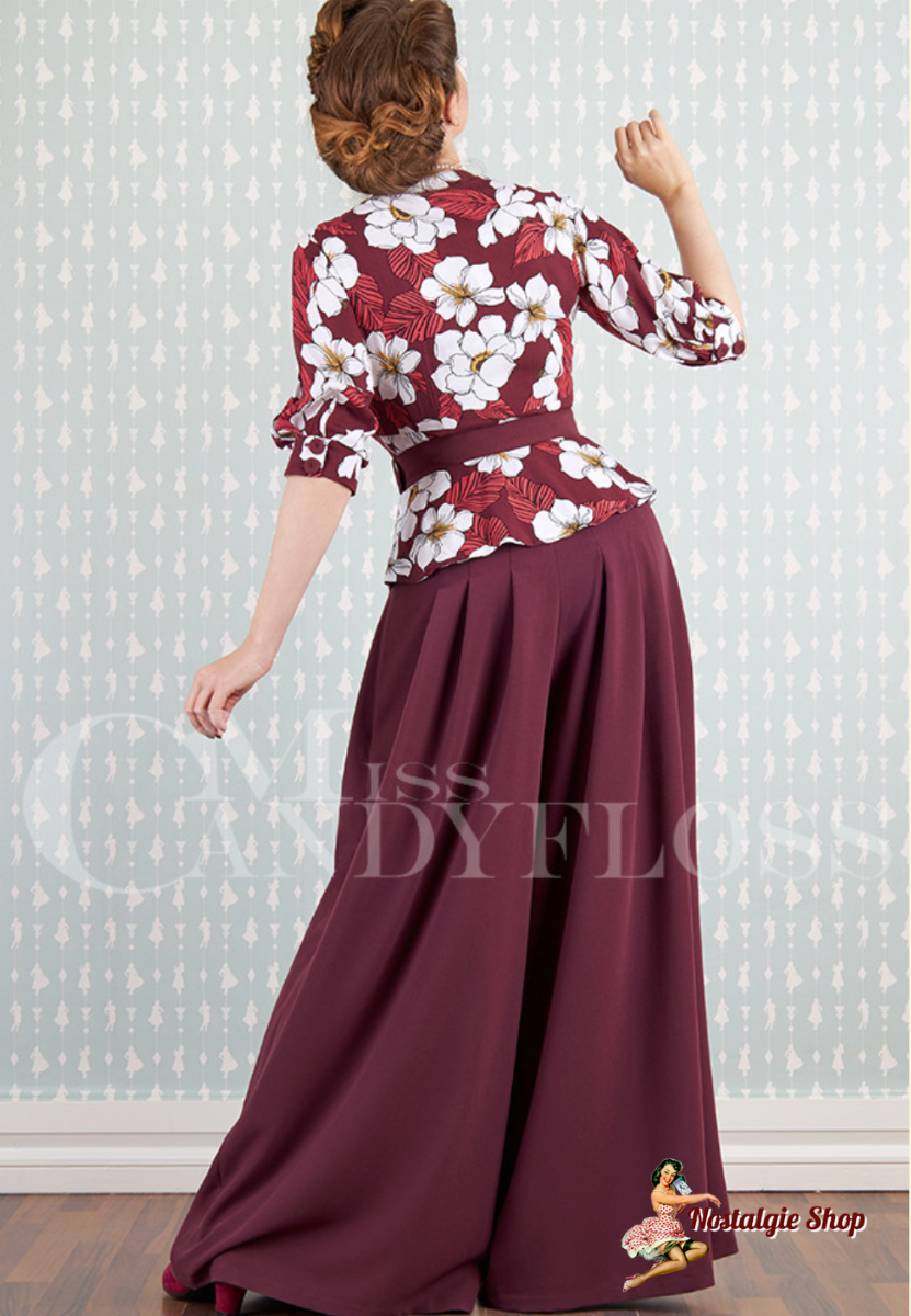 Treten Sie ins Rampenlicht mit unserem bezaubernden Ladivina-Bo, einer Kreation im Vintage-Stil, die Eleganz und Komfort für jeden Anlass vereint. Es ist mit einem figurschmeichelnden Oberteil mit anmutigem V-Ausschnitt und zarten Falten geschmückt und verfügt über praktische Taschen sowie einen klassischen Reißverschluss und Knopfverschluss vorne. Die Schößchentaille ist aus üppigem Stoff mit Blumenmuster in einer herrlichen Palette von Farbtönen wie Cremeweiß, Gelb und dunklem Weinrot gefertigt und harmoniert hervorragend mit weiten Swing-Hosen in Weinrot. Der passende Gürtel betont Ihre Silhouette und macht es perfekt für schillernde Soirées oder um alltäglichen Ensembles Vintage-Charme zu verleihen. Lassen Sie sich vom unvergänglichen Charme von Ladivina-Bo verzaubern und bereichern Sie Ihre Modereise.